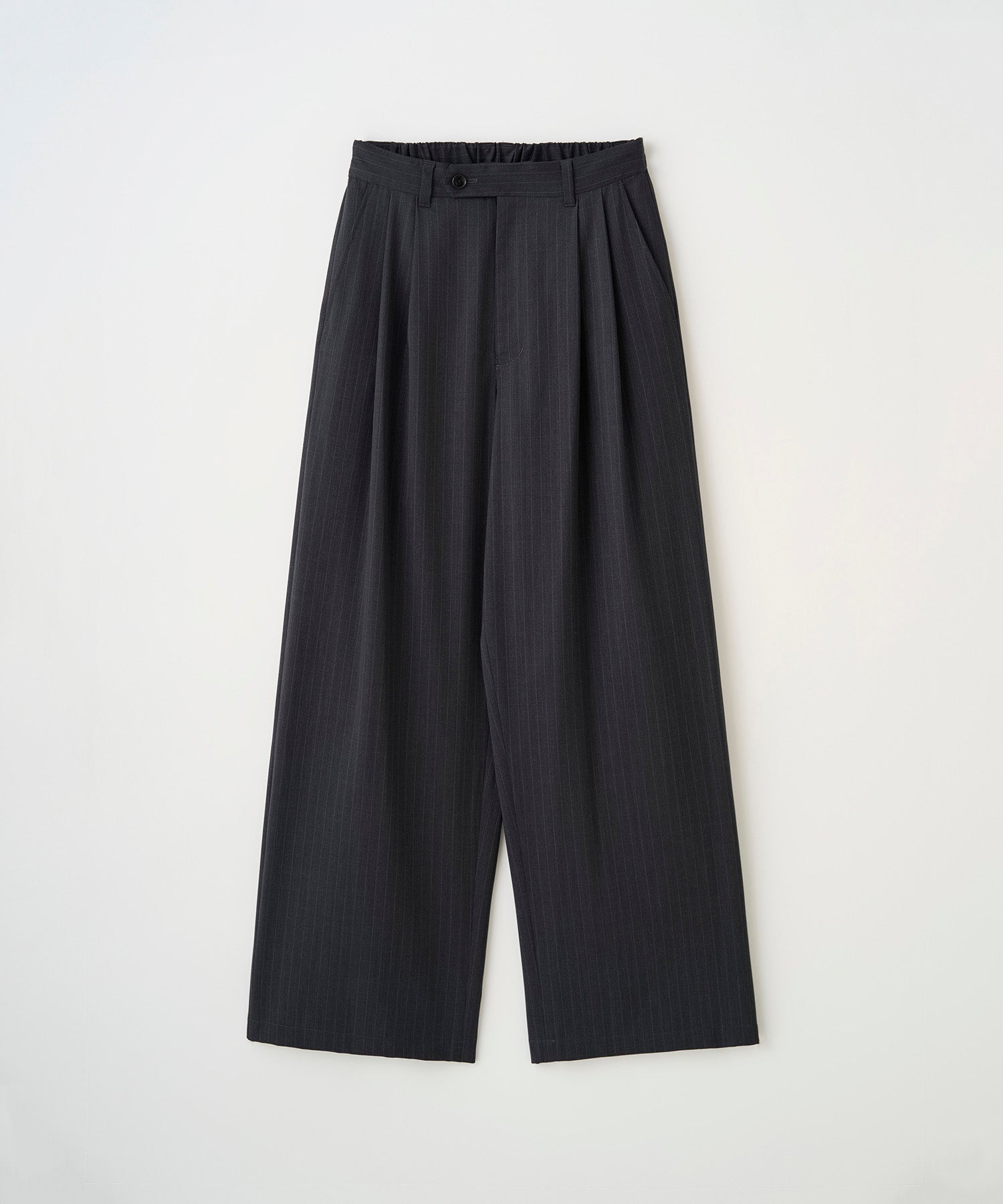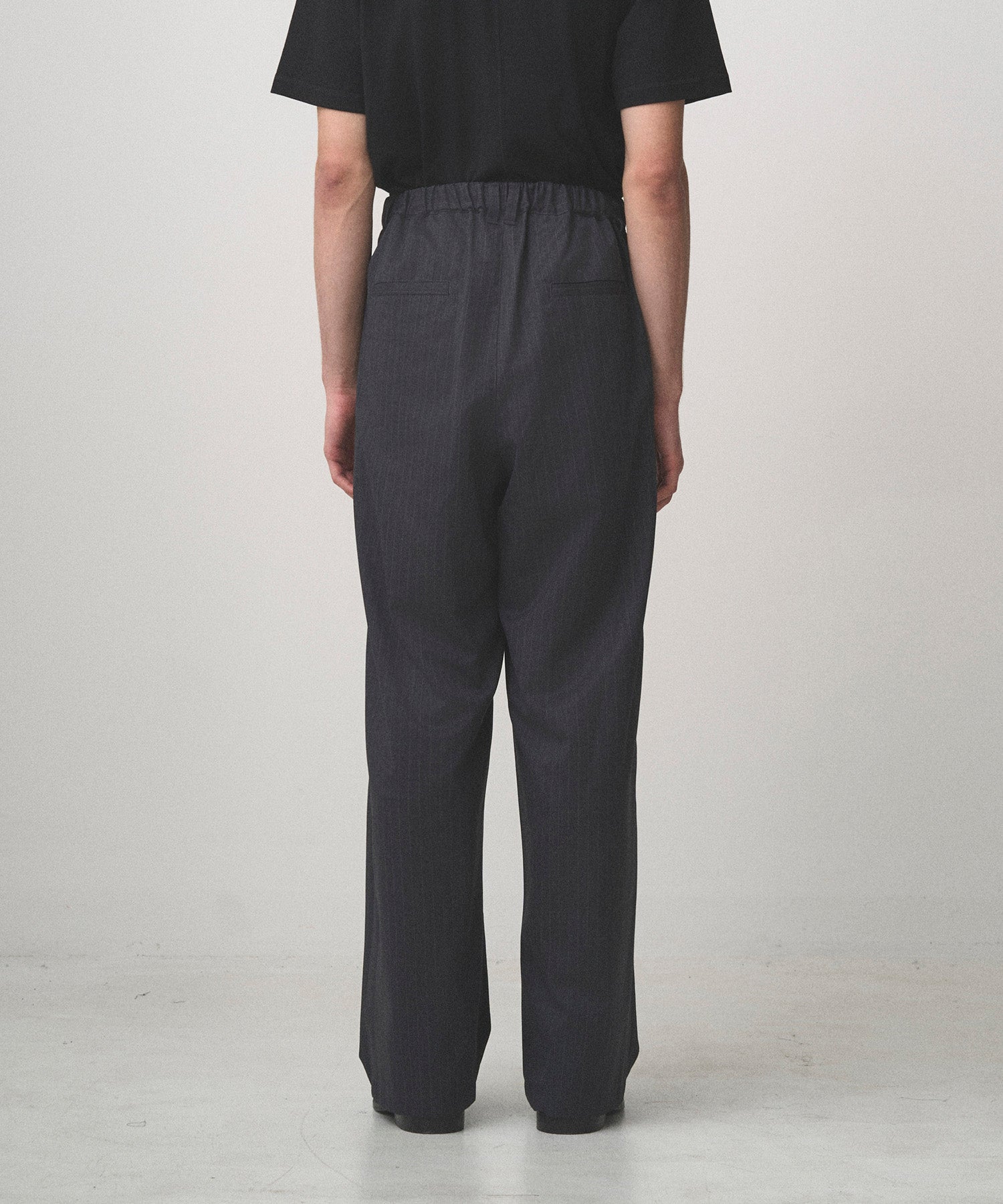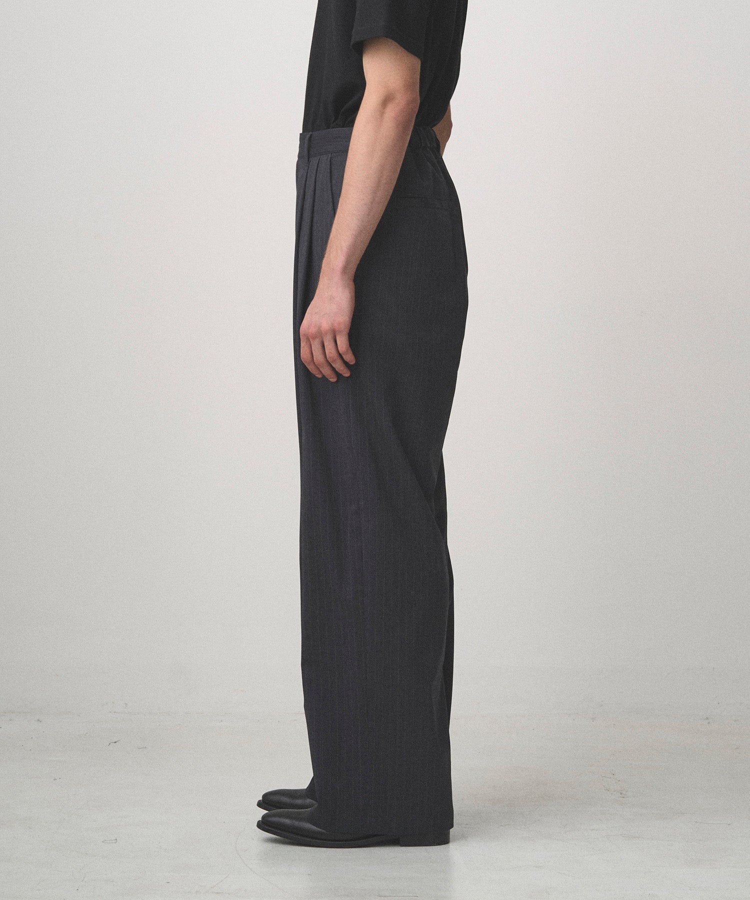 深い 2 タックで腰回りにゆとりを持たせた極太ワイドシルエット。ベルト後ろ部分にゴムを配し、快適なフィット感を実現。