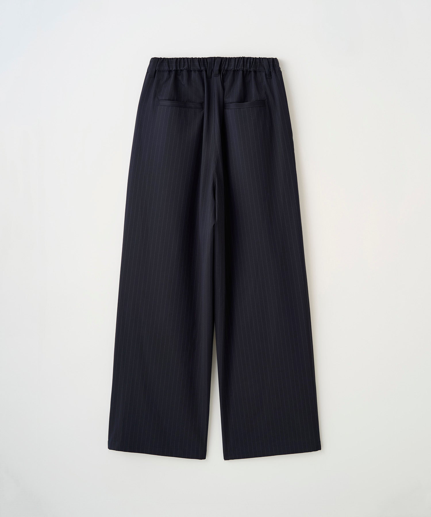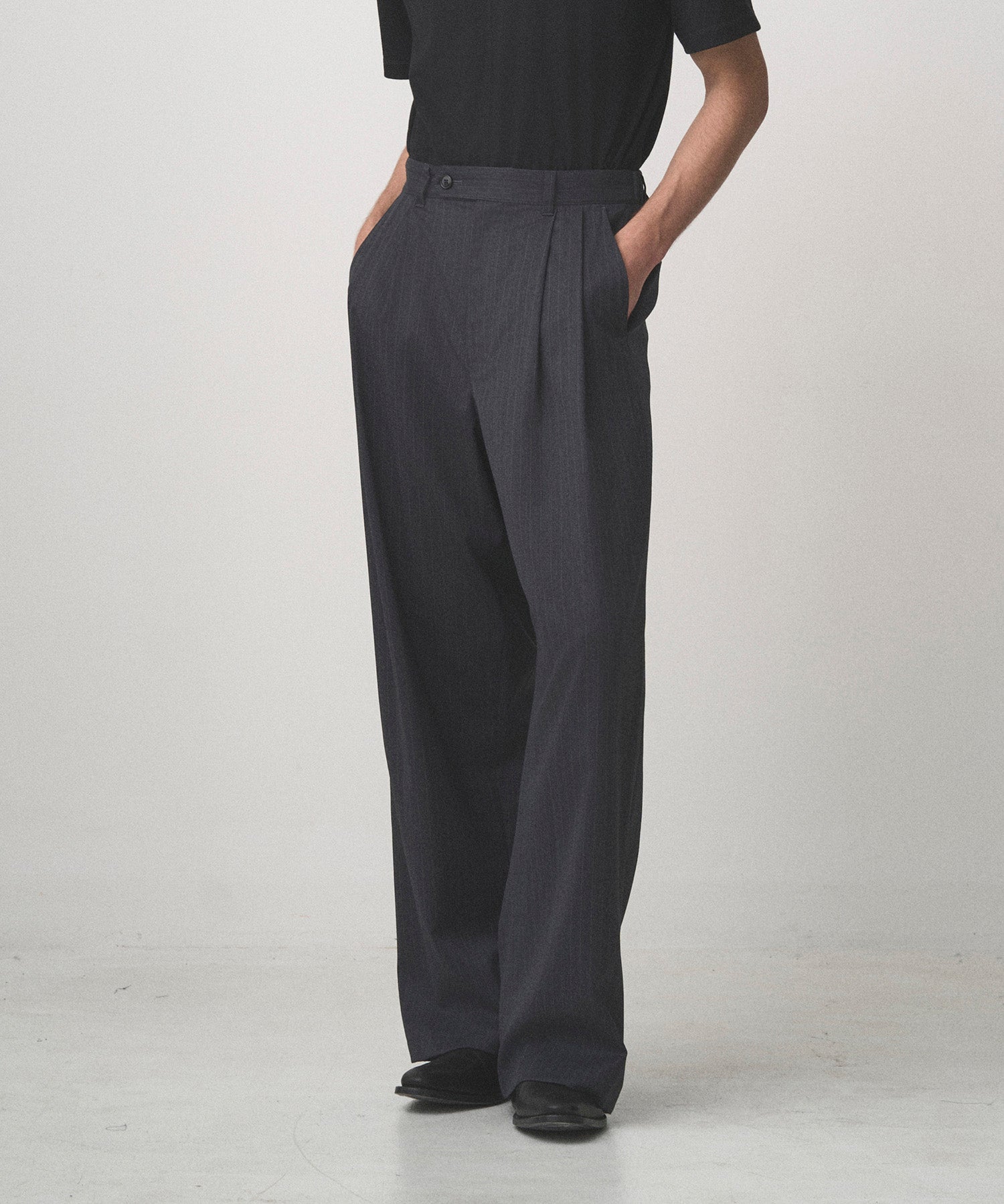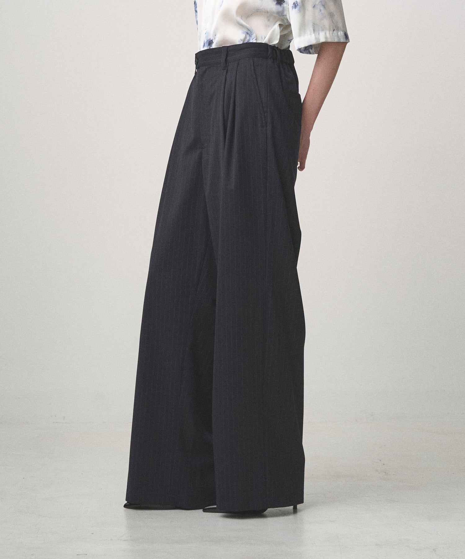 深い 2 タックで腰回りにゆとりを持たせた極太ワイドシルエット。ベルト後ろ部分にゴムを配し、快適なフィット感を実現。