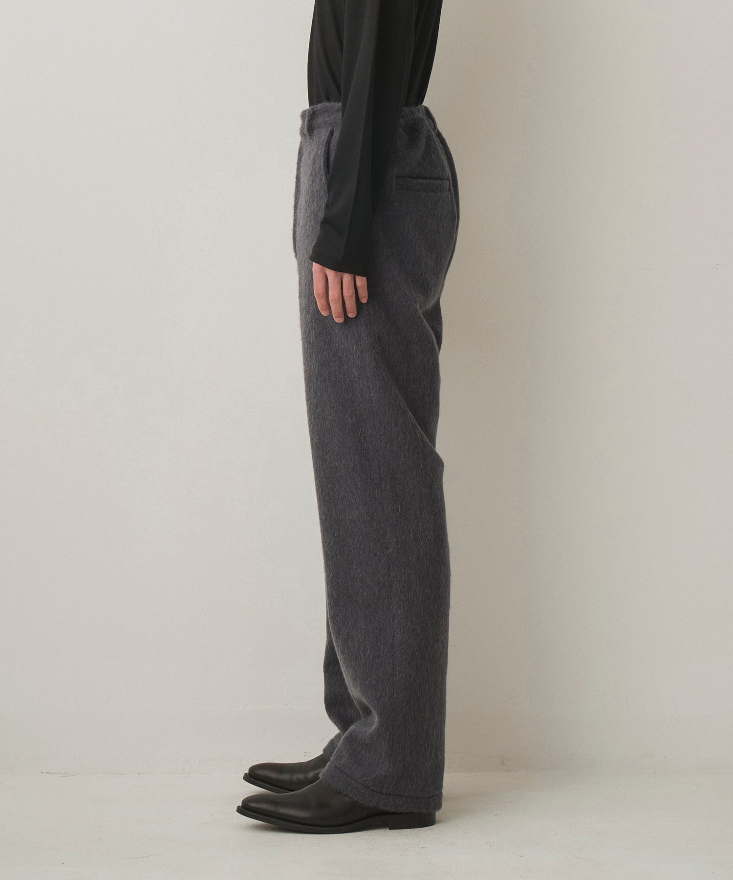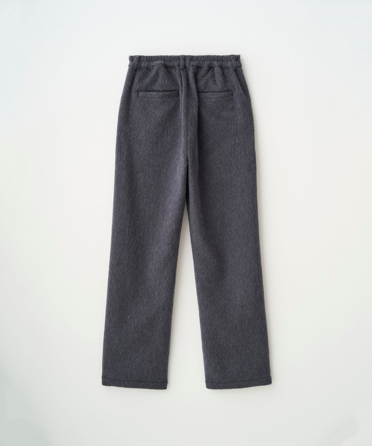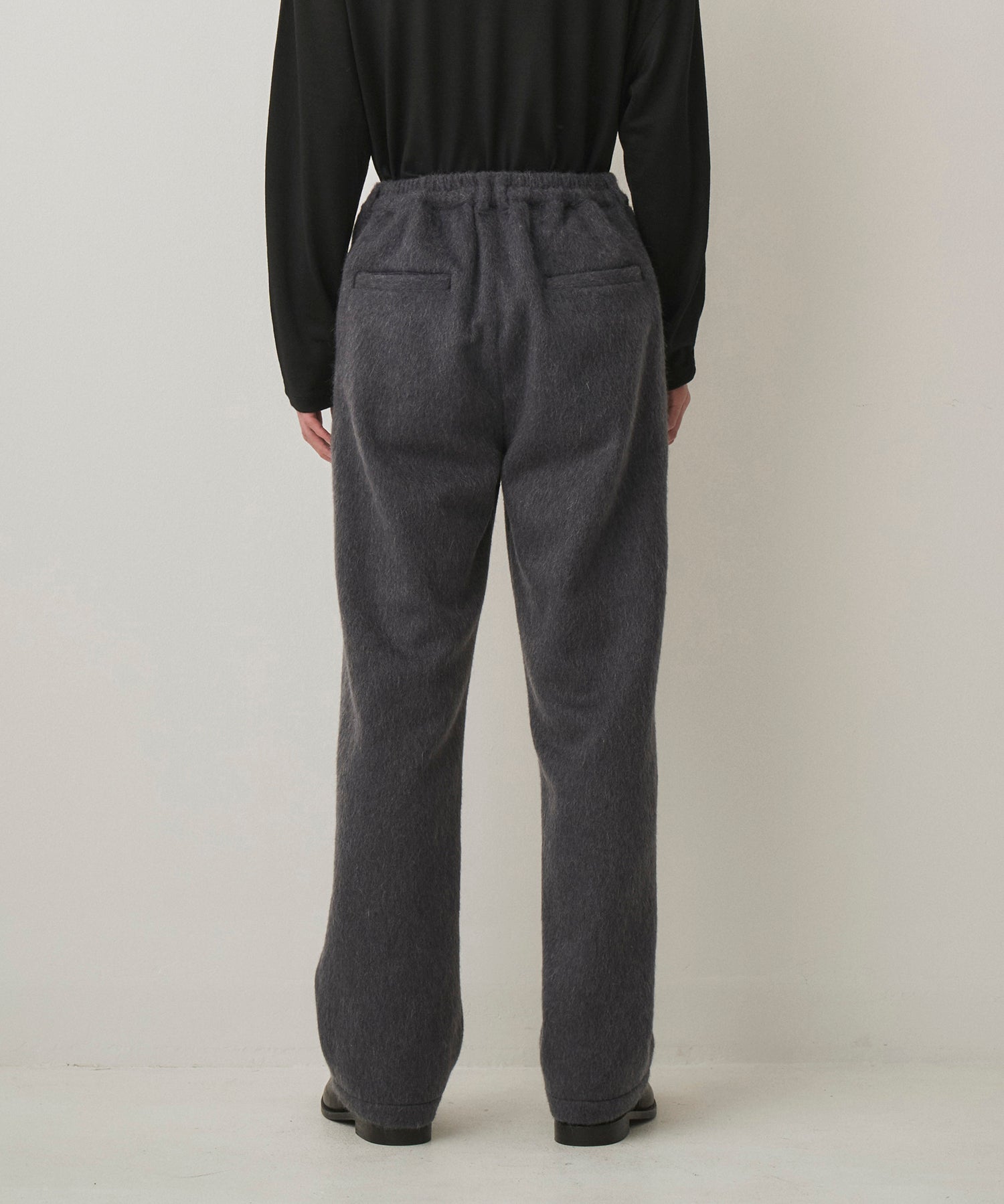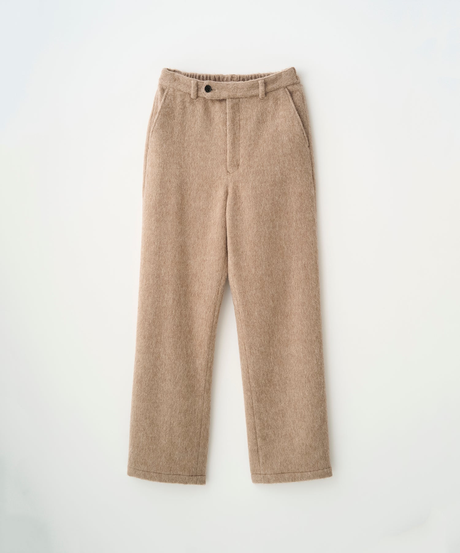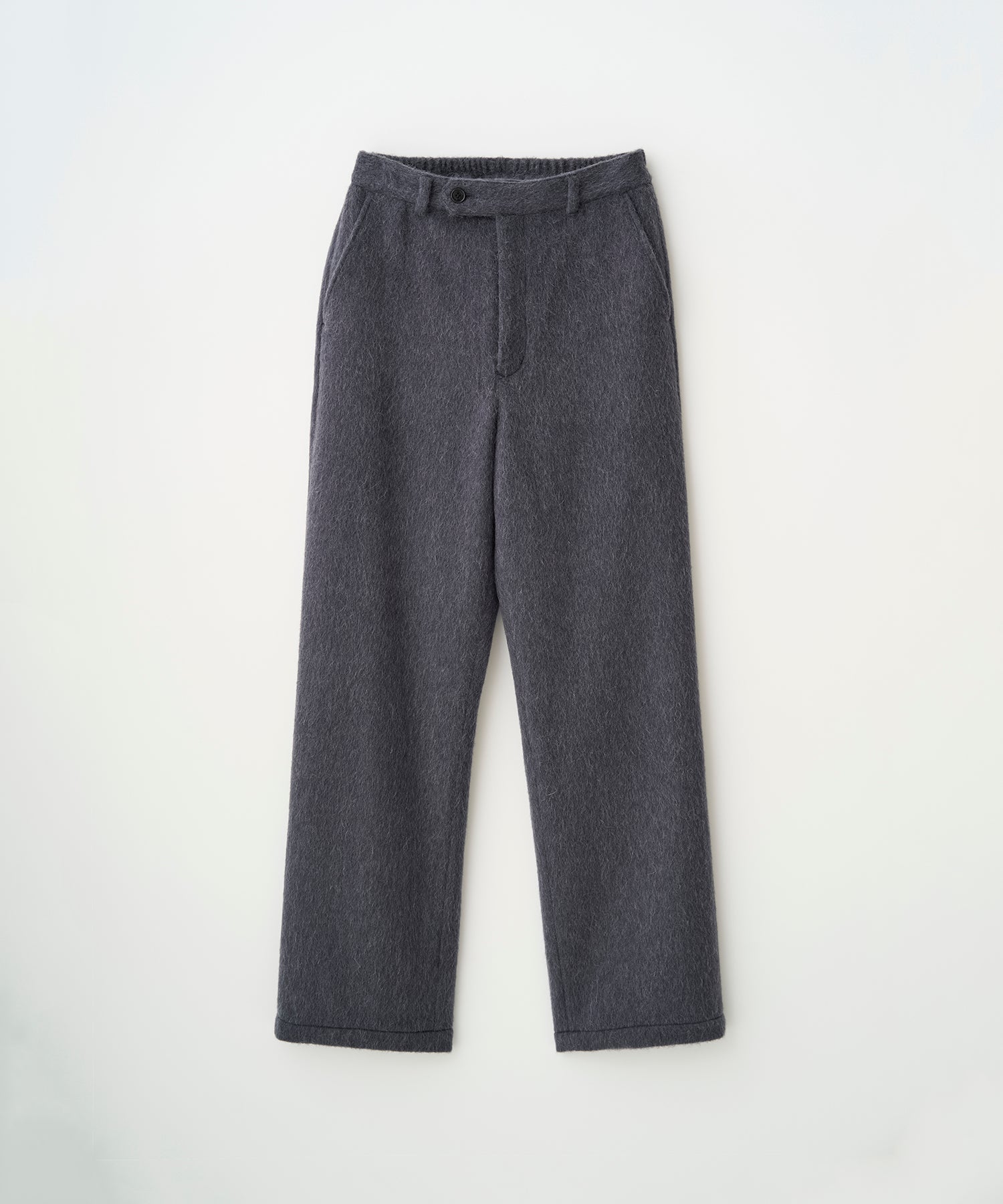 ・キッドモヘアを贅沢に使用したシャギーパンツ。ワタリにややゆとりを持たせ、裾にかけて緩やかなテーパードをかけたリラックスシルエット