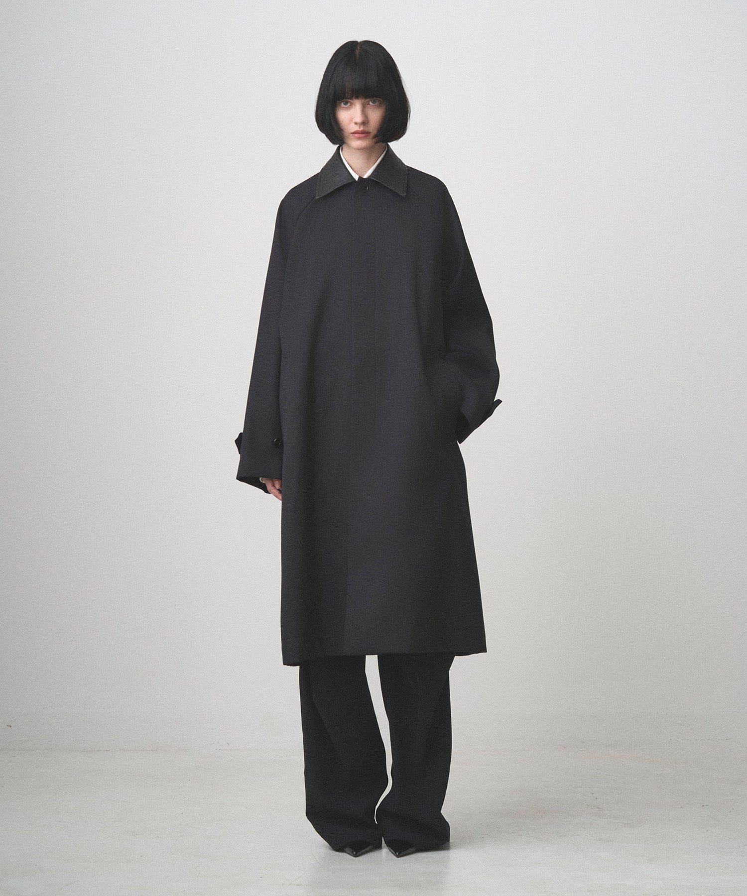 たっぷりとした分量感のステンカラーコート。インバーテッドプリーツにより柔らかなドレープが生まれます。