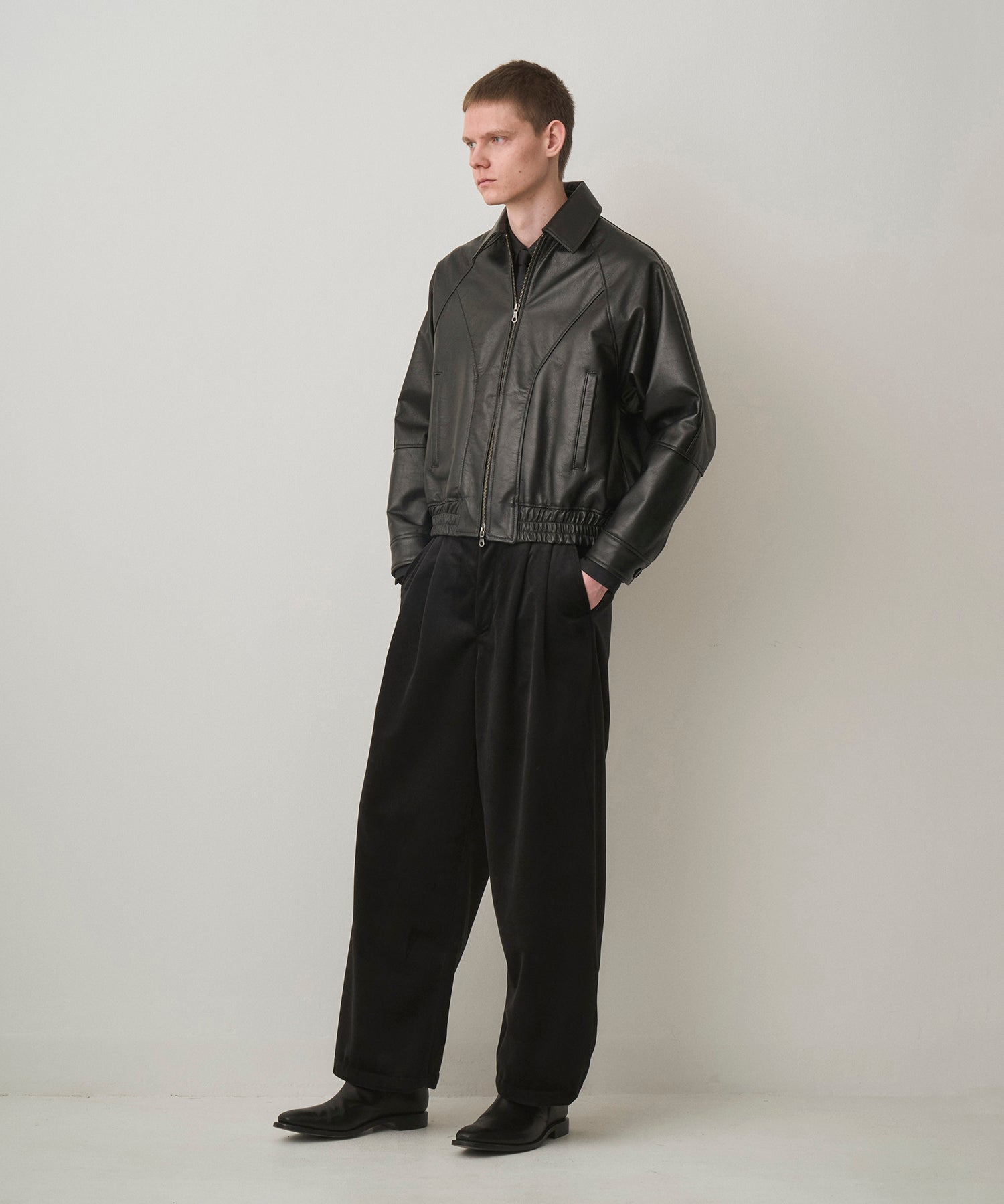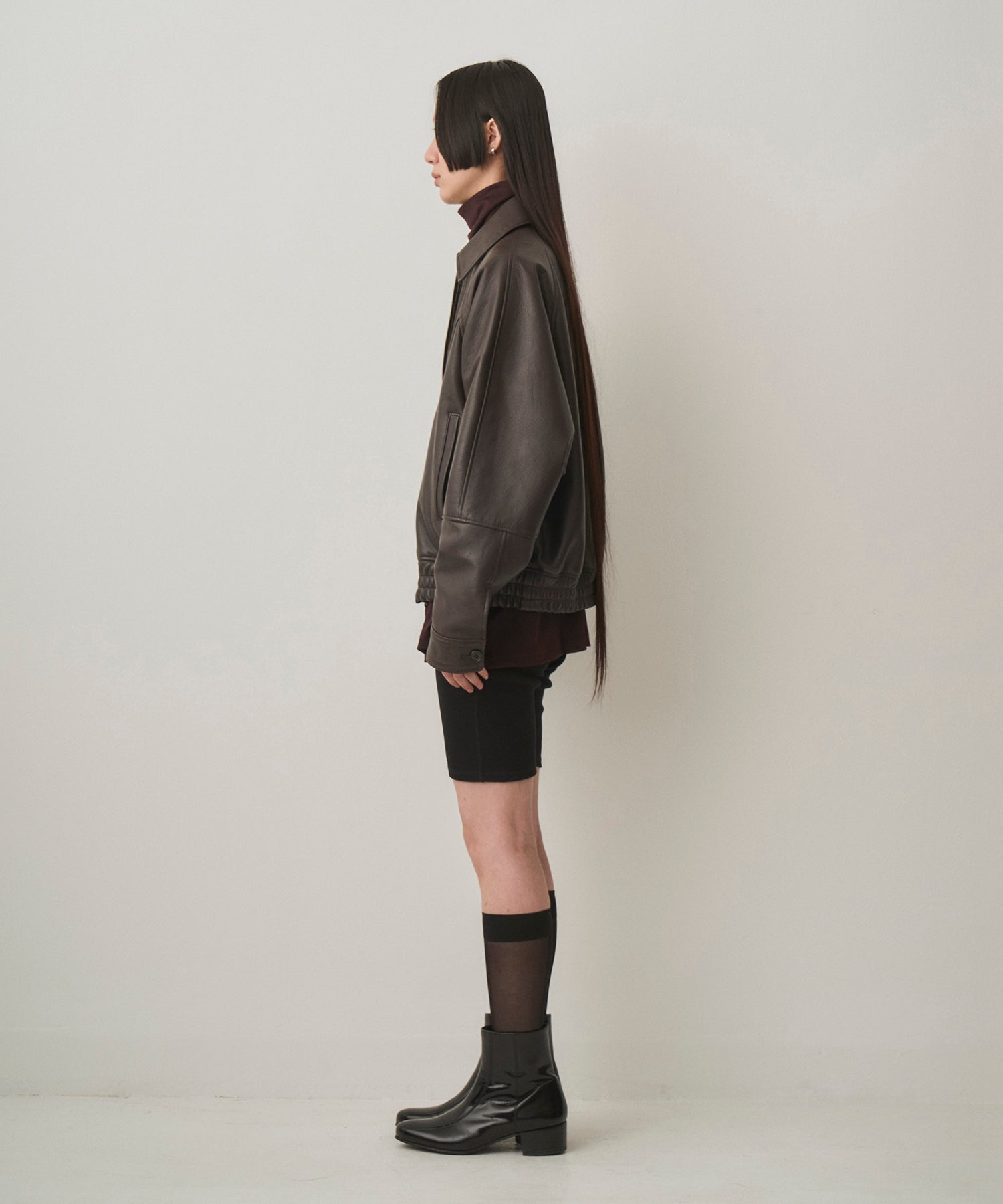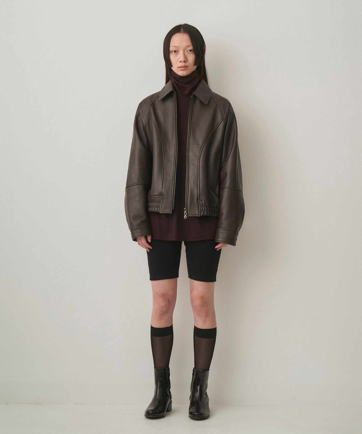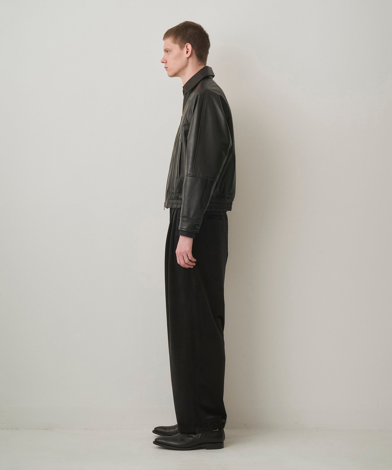 ・レザーのボンバージャケット。ショート丈、太めのアームホール、ゆとりのある身幅でリラクシングな着用感を実現しつつ、裾に強く絞りを入れたメリハリのあるシルエット