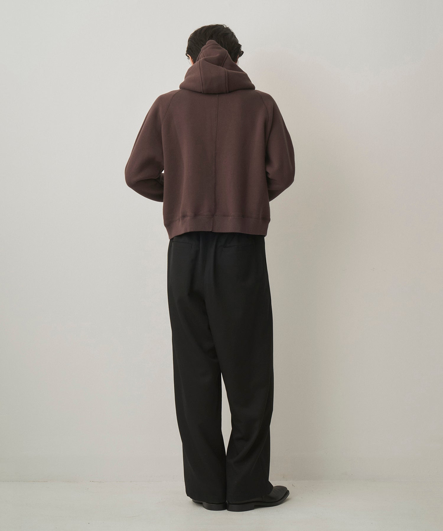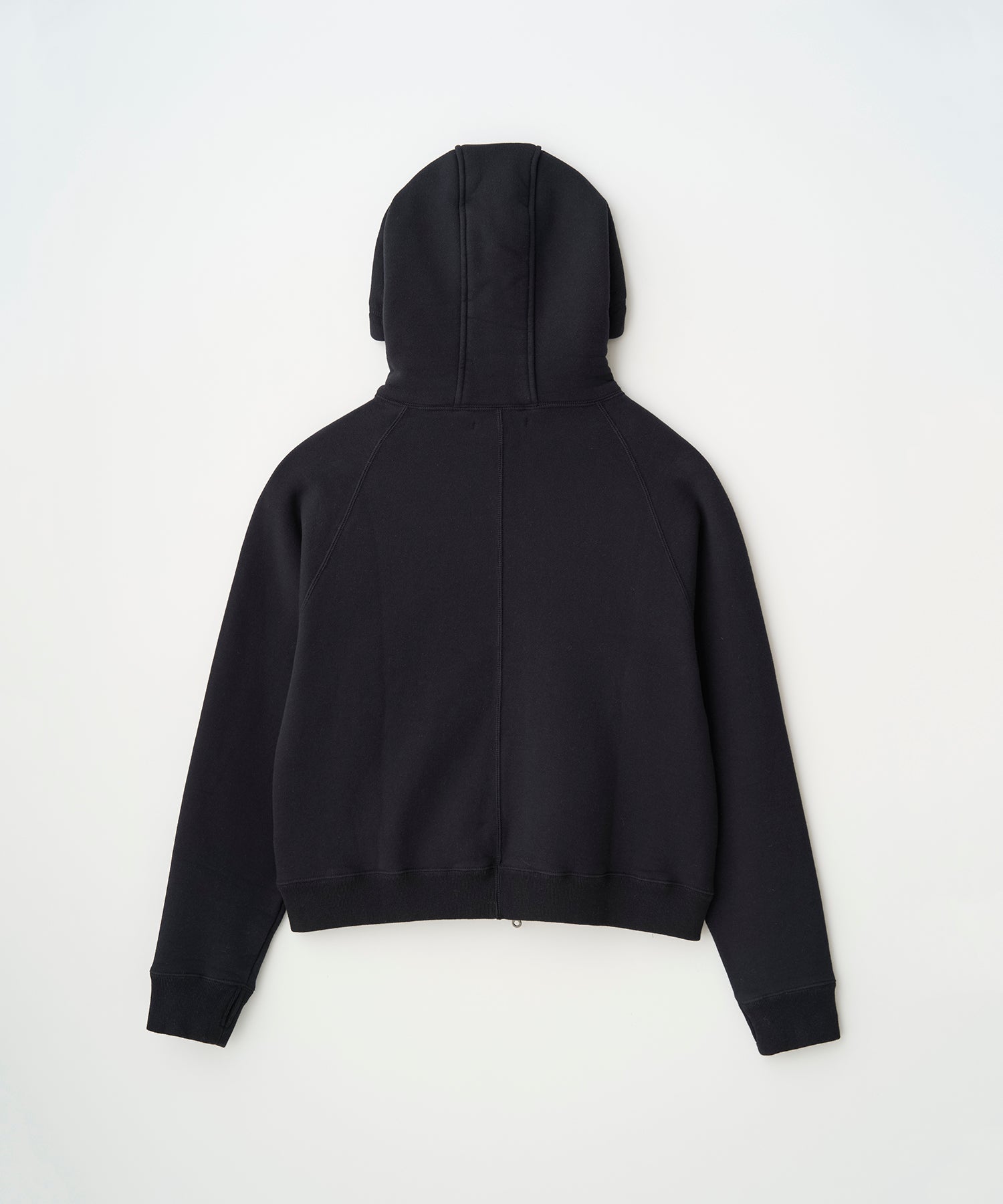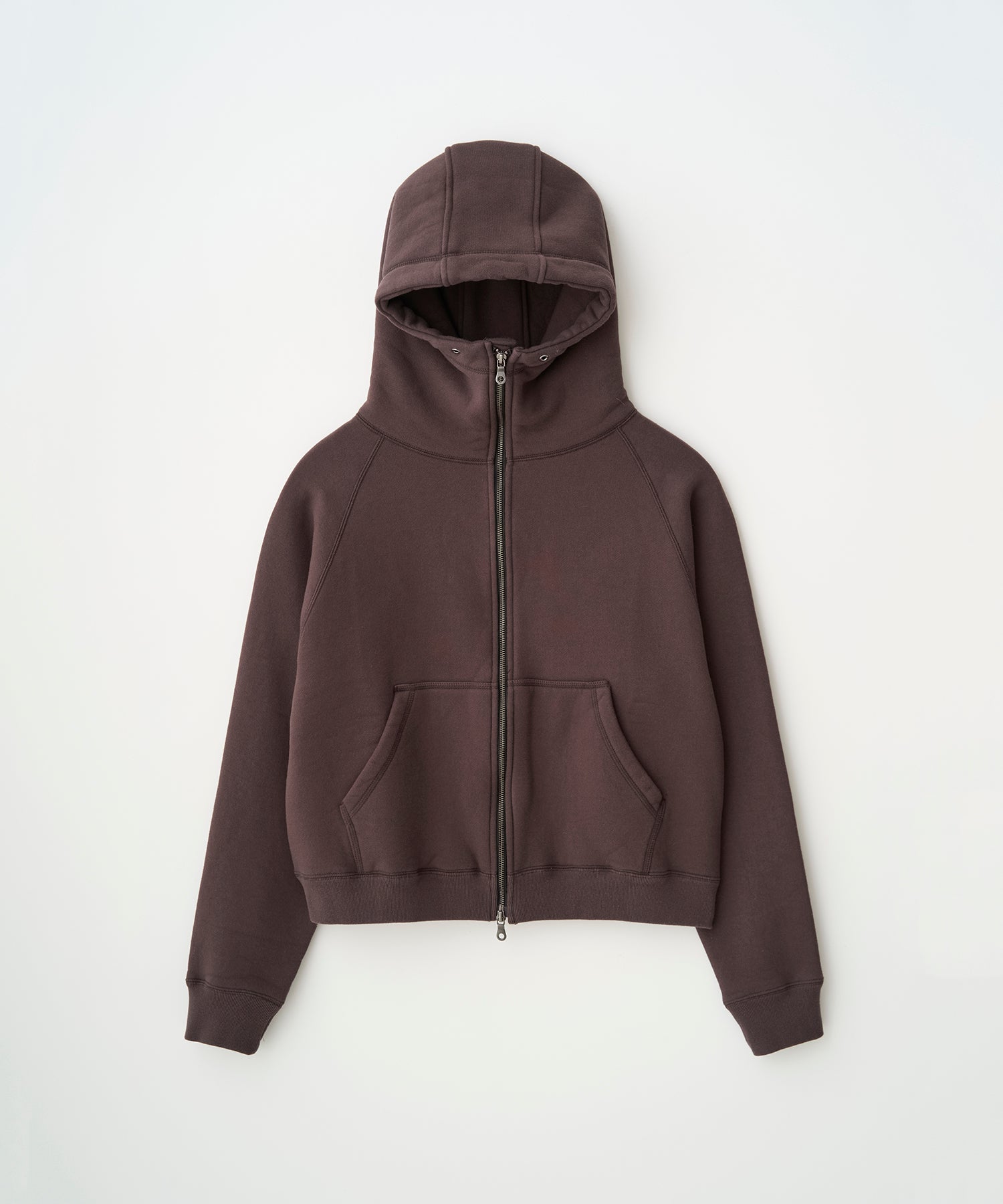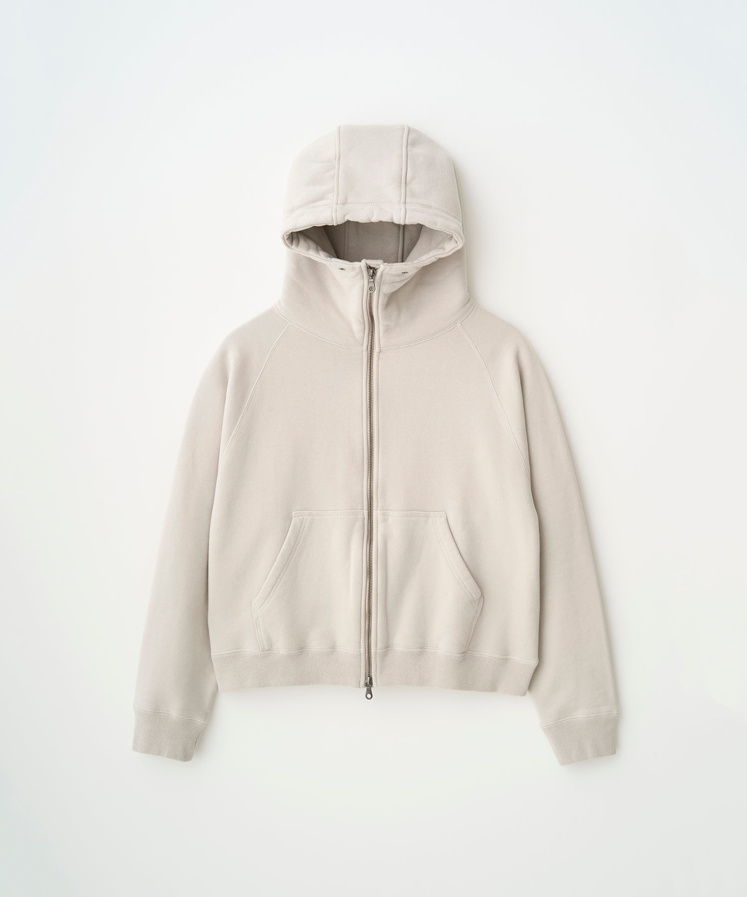 ・ジップアップのフーディー。両振りの三本針ステッチを採用し、首元は高めに設定。バラクラバのように顔周りを暖かく包み込みます
